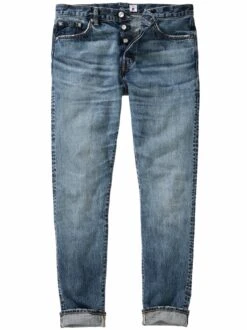 Jeans-Kenner schätzen ihre Authentizität, ihr Gewicht von immerhin 13,5 oz, ihre (vor allem anfängliche) Festigkeit, ihre individuelle Anpassung nach mehrfachem Tragen. Der ausgewählte Nihon Menpu Black Rainbow Selvage Denim macht die Jeans so besonders, stammt aus Japan und wird nur noch auf einer Handvoll aus den USA importierten Webstühlen produziert. Ihrem etwas tieferen Sitz und dem ab Kniehöhe schmaler werdendem Bein verdankt sie ihren entspannten Schnitt. Klassiker und Lieblingsstück zugleich.