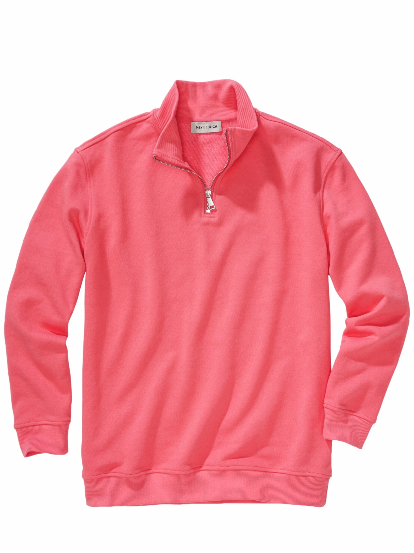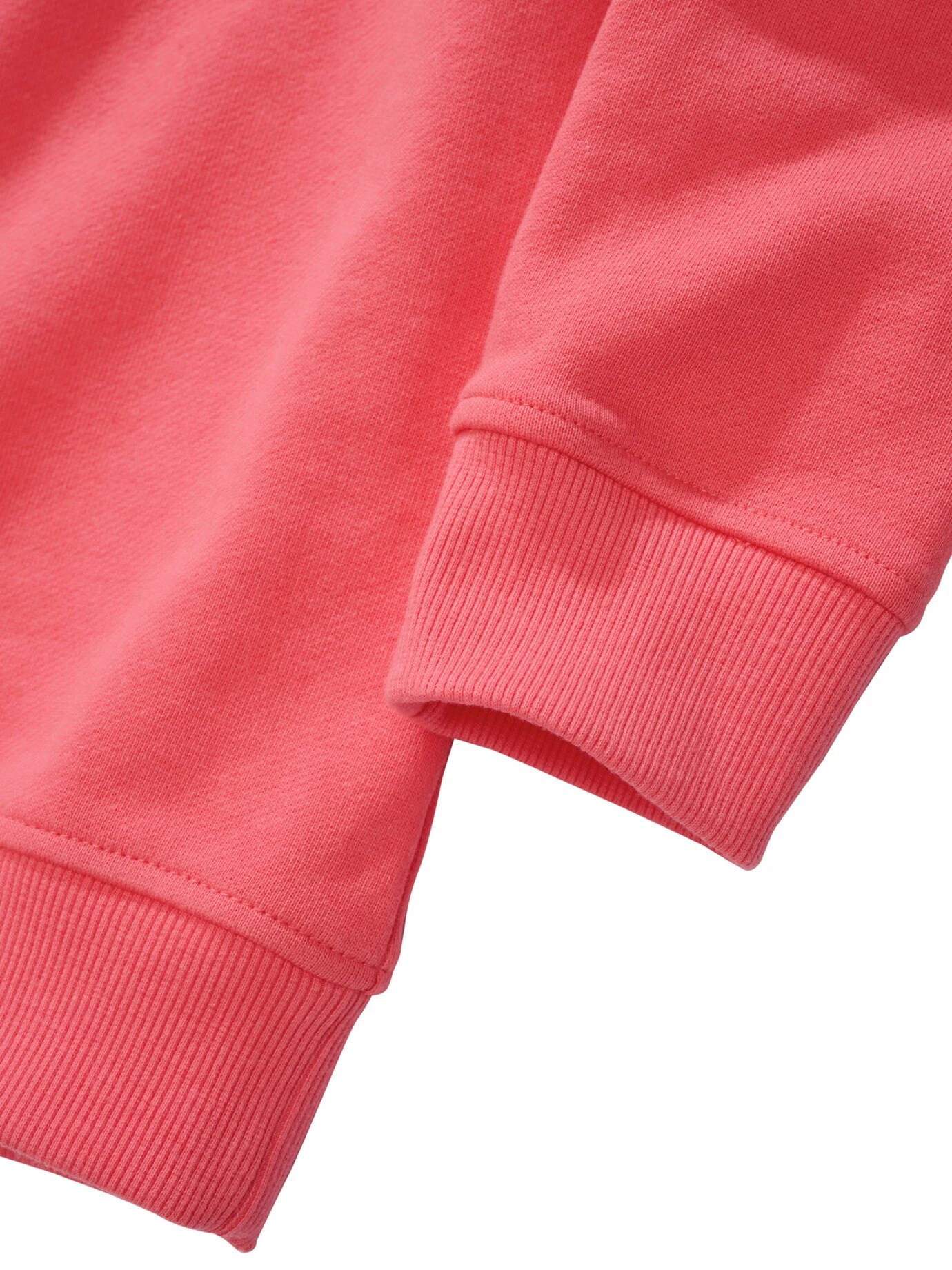 Löst ein glückliches Grinsen aus. Das Sweatshirt aus leichtem Baumwollmix speichert gute Erinnerungen für trübe Tage. Außen (offensichtlich) und innen: Denn die weiche French-Terry-Qualität besteht auf der linken Stoffseite aus kleinen Schlingen, die Feuchtigkeit und Gerüche absorbieren und dabei Wärme speichern. Mal luftig, mal hochgeschlossen, funktioniert der Troyerkragen mit Reißverschluss. Und weil der Sweater so fröhlich und flexibel ist, ist er immer dabei, im Auto, Rucksack oder Handgepäck.