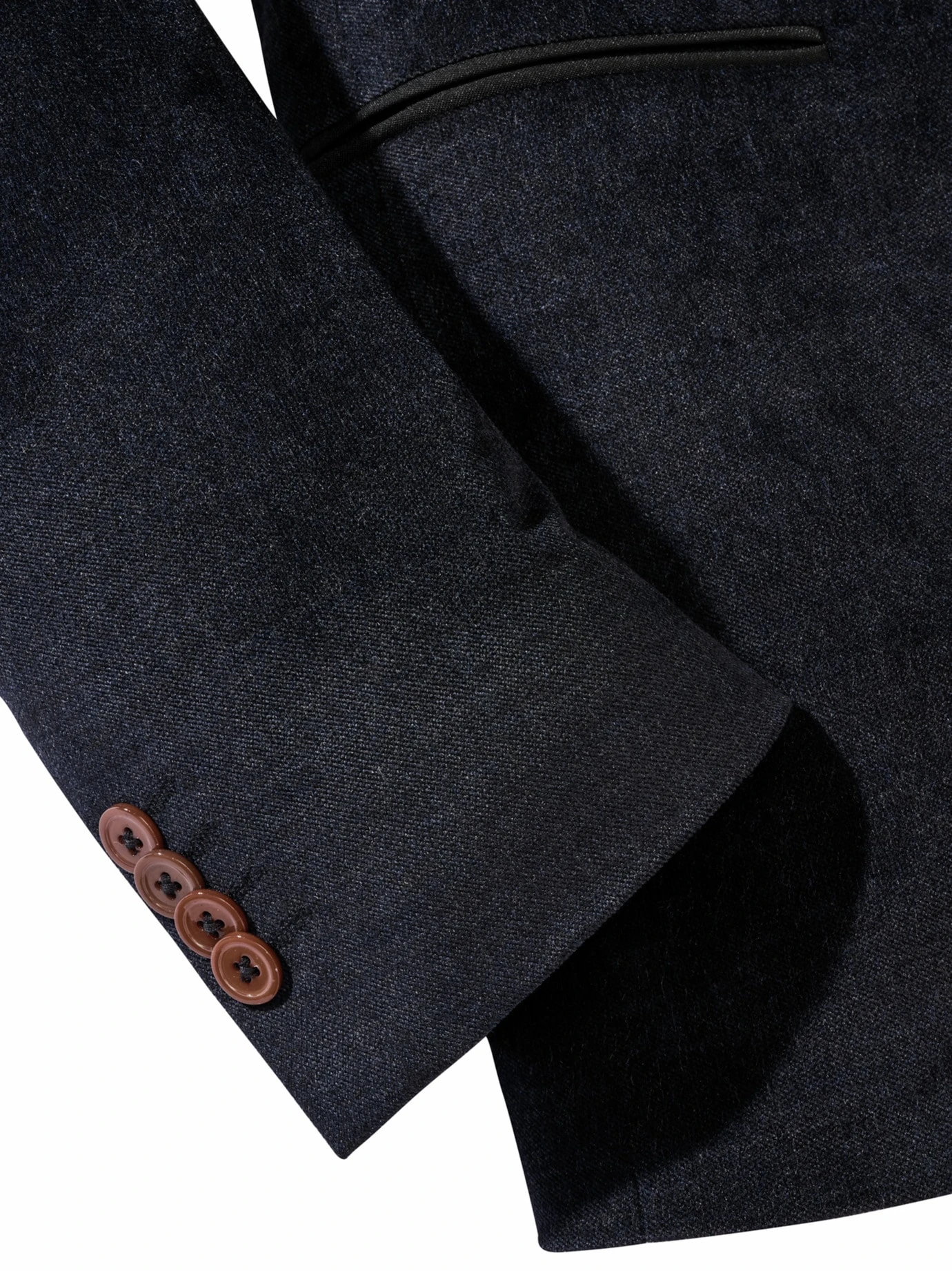 Dresscode RSVP. Die größte Leistung des Smokingjacketts besteht darin, die Aufmerksamkeit auf den Anlass des Zusammenkommens zu lenken. Daher ist es fast ausnahmslos dunkel und besitzt allenfalls dezente Details mit Smoking-typischem, steigendem Revers, stoffüberzogenem Knopf und einem mit Satin besetzten Kragenspiegel. Der Rest ist italienischer Samt. Hochwertig, besonders bequem und weniger knitteranfällig. Zudem besitzt er einen sanften Glanz, der je nach Lichteinfall schön nuanciert. Passendes Beiwerk: weißes Hemd mit Umschlagmanschetten, Manschettenknöpfe, schwarze Schleife und auf Hochglanz polierte Schuhe. Den Kummerbund finden wir übertrieben.