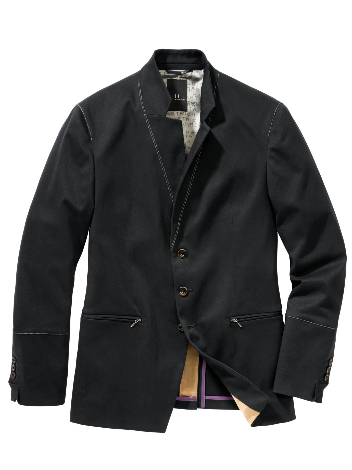 Ihr Jahrgangsbester. Die toskanische Rebsorte Prugnolo hat Doris Hartwich zu diesem Sakko inspiriert: Samtig, kurz vor schwarz – dafür wird die italienische Baumwollmischung angeraut, bis der Griff an Kaschmir erinnert. Die Kontrastnähte seien angelehnt an die Maserung von Gehölz, wie am Reversbruch, wo sie ihr Markenzeichen stilisieren: den Stehkragen. Oder an den umgeklappten Manschettenecken.