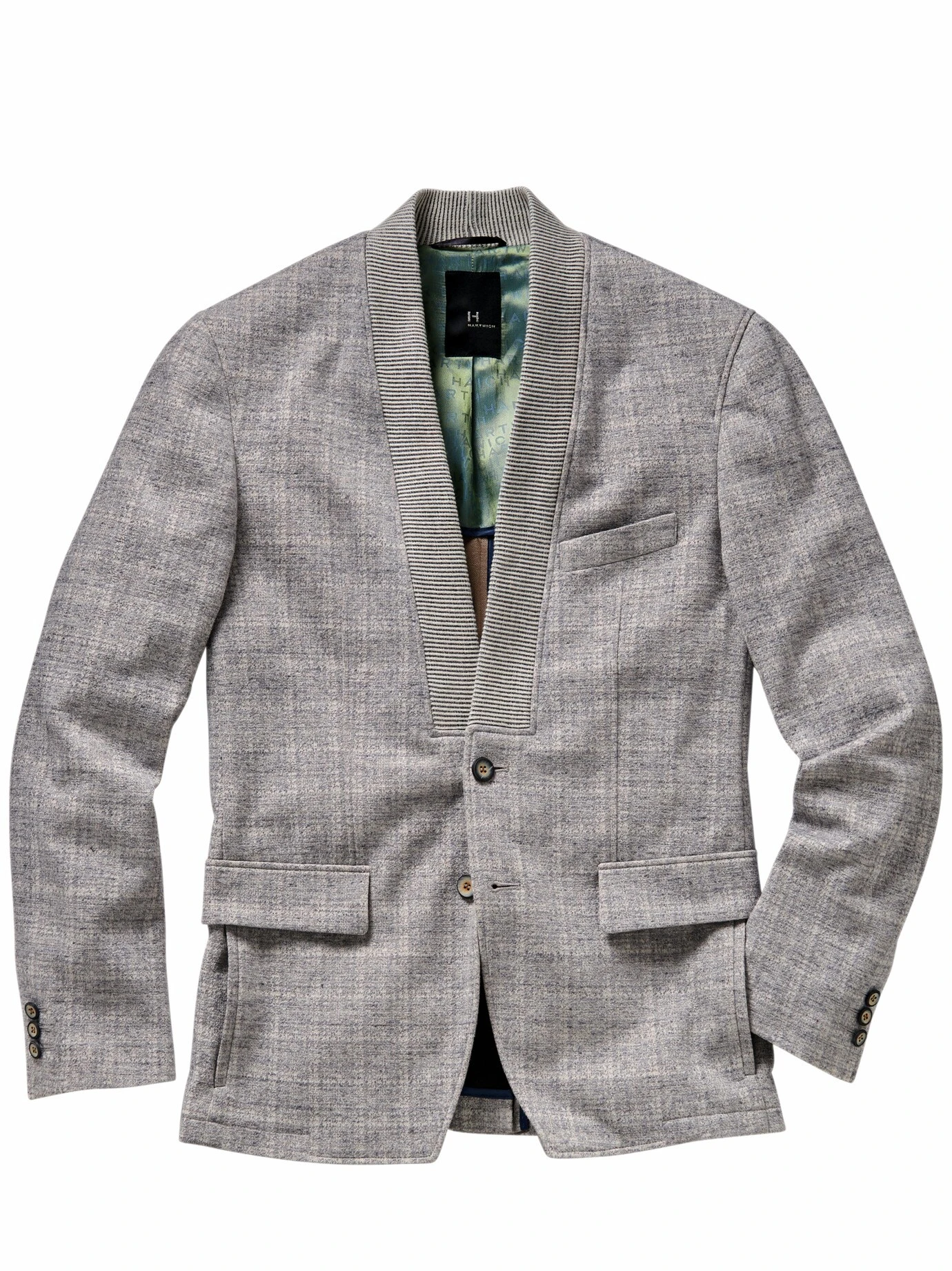 Nicht zu fassen. Ungesehene Stehkragen und selten schöne Details sind die Markenzeichen der Doris Hartwich Sakkos. Die Idee, den gerippten Kragen einer Bomberjacke aufzugreifen und nahtlos bis zum obersten Knopf in das Revers übergehen zu lassen, ändert alles: den Schnitt, den Look und die Bedeutung dieses Sakkos, das beinahe so entspannt daherkommt wie ein Cardigan. Der gewirkte italienische Jacquard mit seinem hauchfeinen Karo ist übrigens so elastisch, dass sich dieses Gefühl auch gleich beim Träger einstellt.