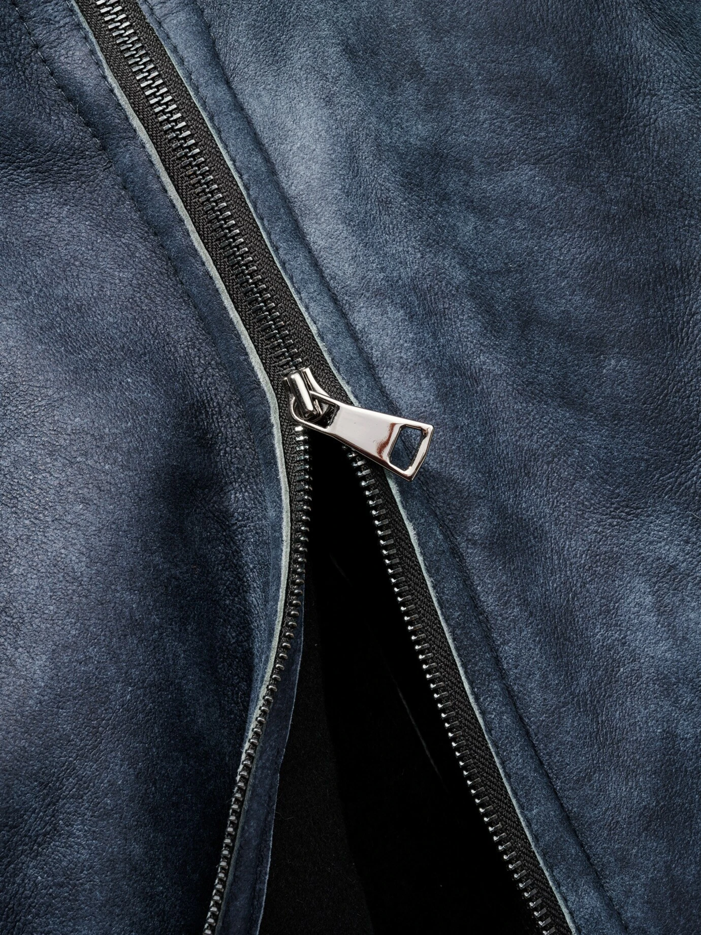Das schönste Gegenteil von Mode. Mit einer Jacke aus gewachsenem Schaffell (außen Leder, innen Teddy-weiches Fell) besitzen Sie eines der langlebigsten Kleidungsstücke. Diese Jacke wird Sie Ihr ganzes Leben begleiten, weil sie robust gefertigt ist und nie aus der Mode kommt – unsere Vorfahren schützte sie bereits vor über dreitausend Jahren vor der Kälte. Innen wärmendes, gelocktes Fell, außen das robuste Leder. Geschnitten wie eine echte Fliegerjacke – mit kurzem Schnitt, gerader Silhouette, schlanken Ärmeln. Gefärbt wie Denim in lebendigem Blau. Das Leder wird übrigens von Hand geschliffen. Schlichter Hingucker zu urbanen Outfits mit Jeans, Cargo oder derber Chino.