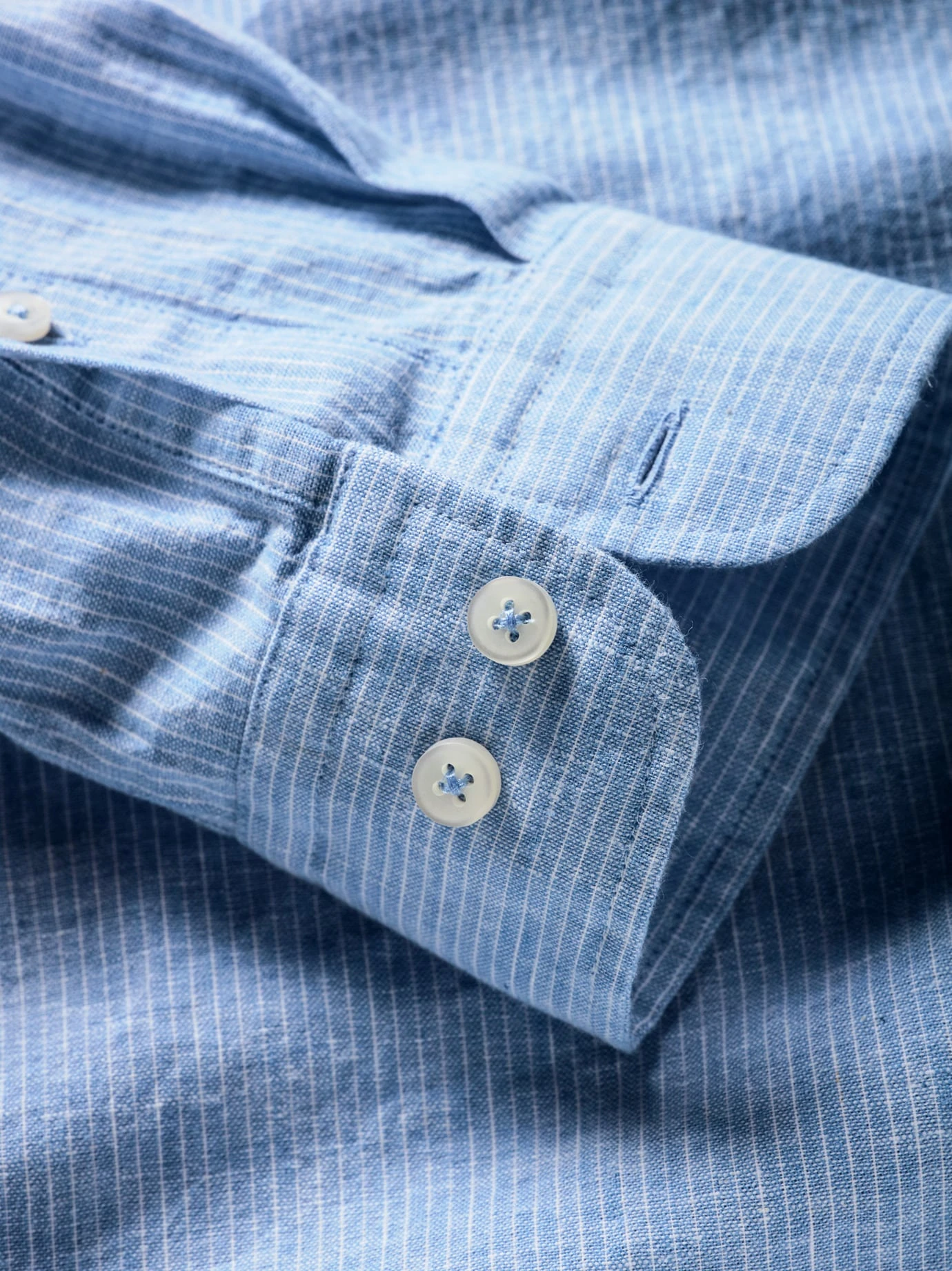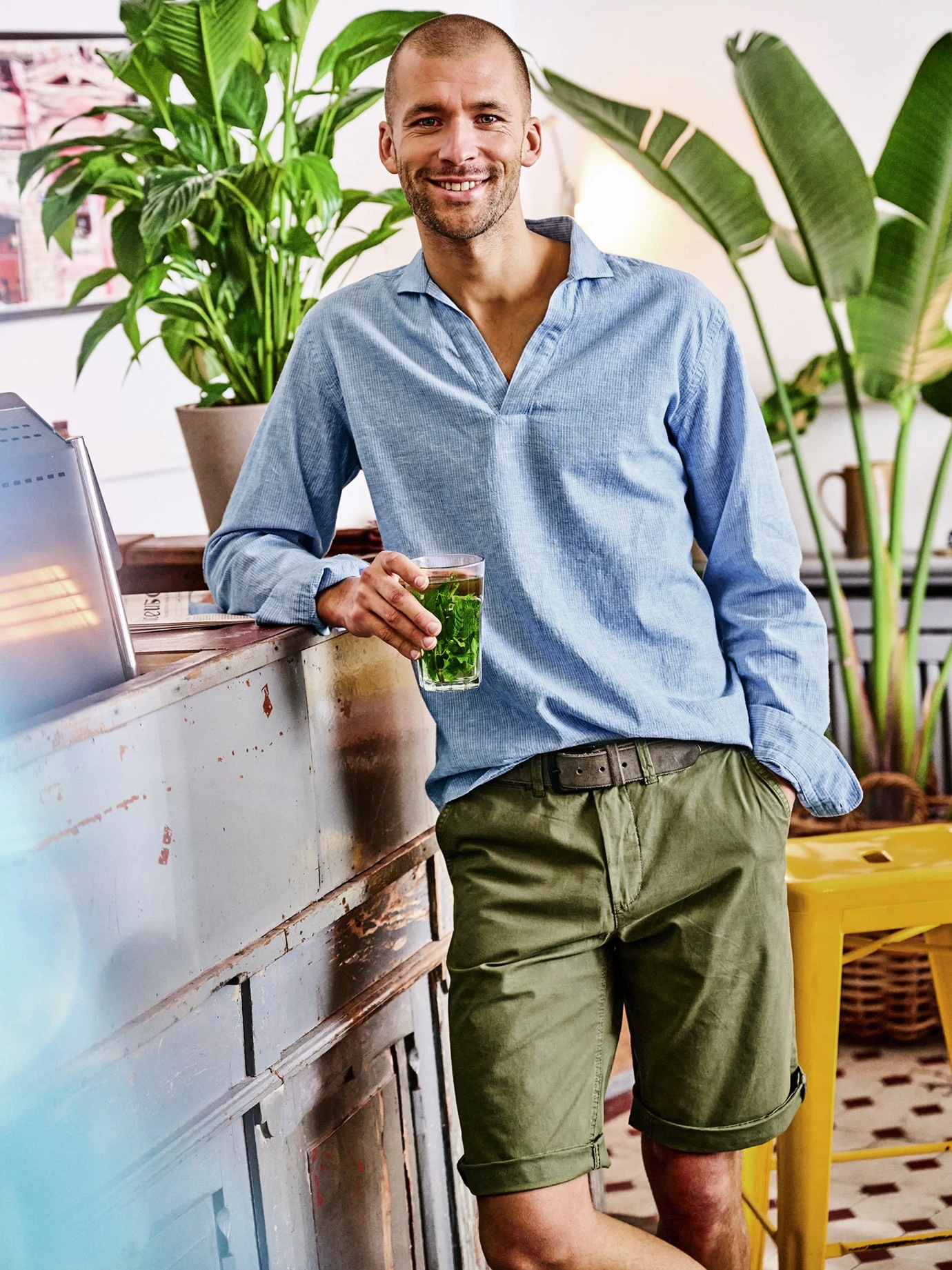 Bei Temperaturen über 30 °C ist es eine Herausforderung, gut angezogen zu sein. Ein Leinenhemd macht dann den halben Job. Der etwas festere Stoff steht immer ein wenig von der Haut ab und wirkt dadurch wie ein Blasebalg, der Luft zufächelt. Und da, wo das Hemd die Haut berührt, nimmt es mehr Feuchtigkeit auf als Baumwolle, ohne sich nass anzufühlen. Für dieses Hemd wurde hochwertige Baumwolle mit Leinen gepaart (knittert weniger). Es kommt ohne Knöpfe am Kragen aus und fällt am Hals genauso entspannt wie ein cooler V-Ausschnitt.