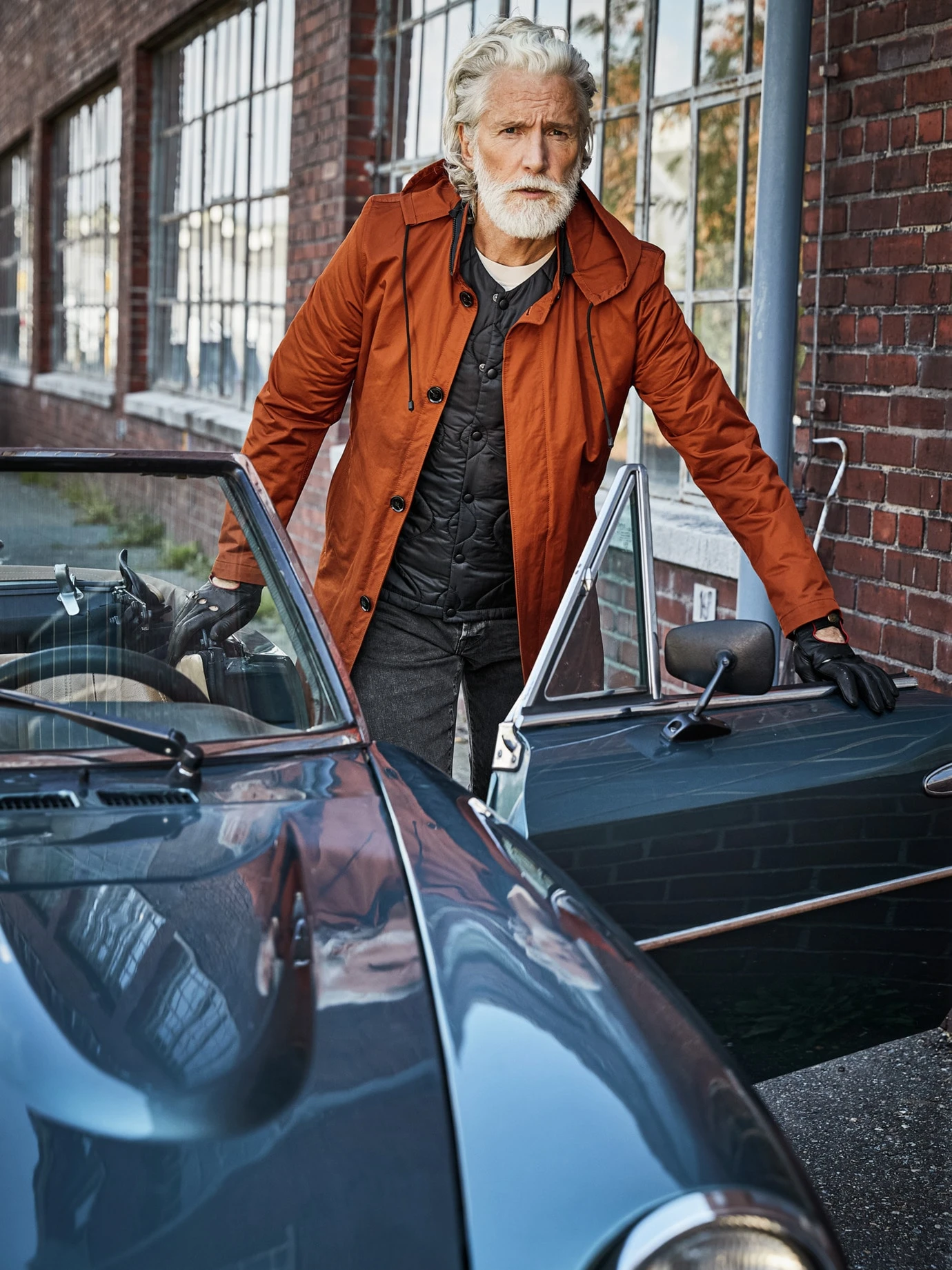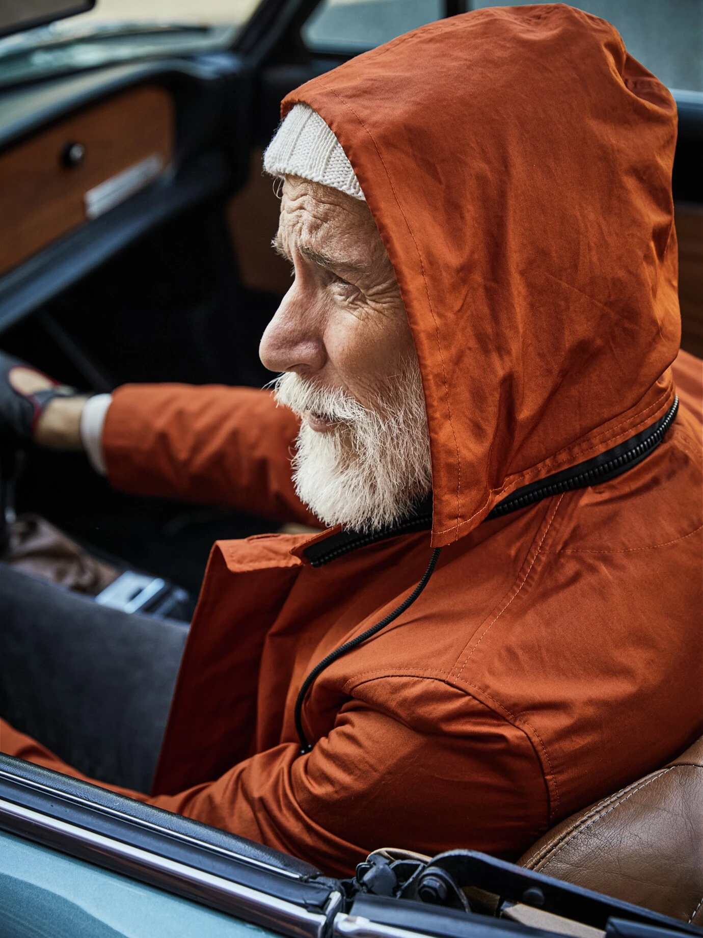 Innovative Kapuzen-Umsicht. Die Kapuze dieses Mantels ist als Rotor eingearbeitet. Selbst mit Kapuze auf dem Kopf geht sie mit, in der Bewegung läuft sie einfach auf einem Zahnkranz mit, der sich als Kontrast am Kragen abzeichnet. Garantiert freie Sicht und gute Wärme. Die ausknöpfbare Weste kann auch nach innen geknöpft werden, damit sie unterm Sakko unsichtbar wärmt. Vom portugiesischen Traditionsweber Riopele stammt der dicht gewebte Baumwollstoff, der die Jacke einen kurzen Schauer überstehen lässt.