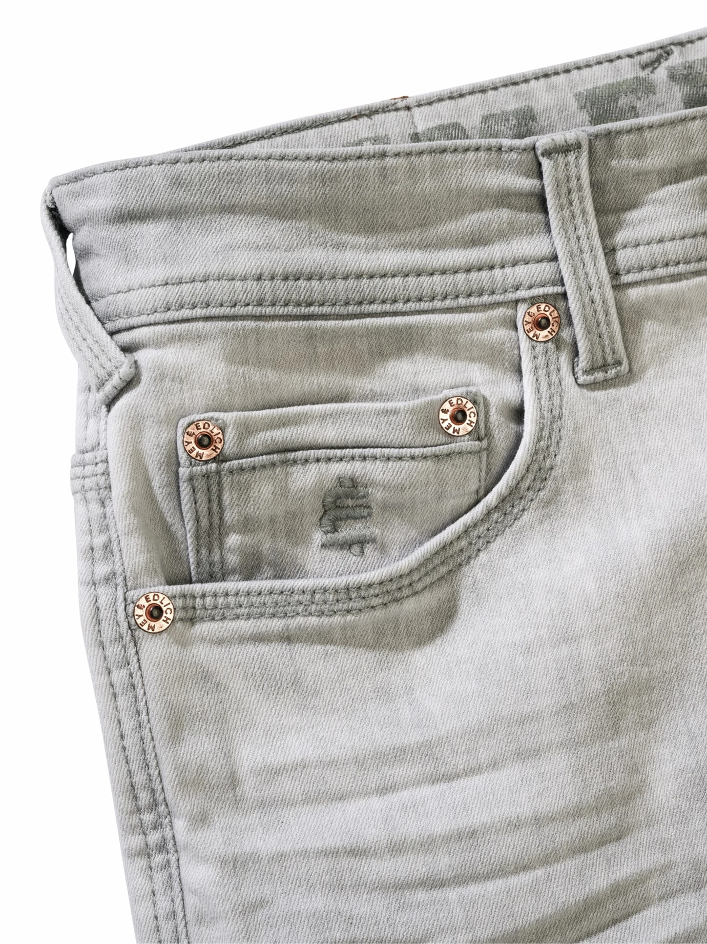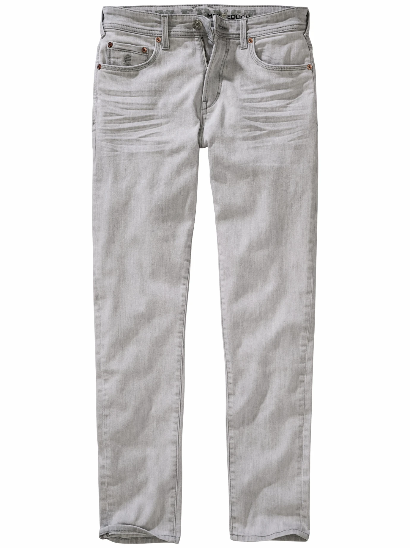 Gutes Bild. In der Schwarz-Weiß-Fotografie lenkt der Verzicht auf Farbe die Aufmerksamkeit auf Formen, Linien und Kontraste. Diese Idee trägt nun die Jeans. Die ausgeprägt verwaschenen Sitzfalten und feine Wrinkles entlang der Nähte erzeugen Reflexe und lassen den Denim in einem besonderen Licht erscheinen. Alles Weitere machen die schönen Details.