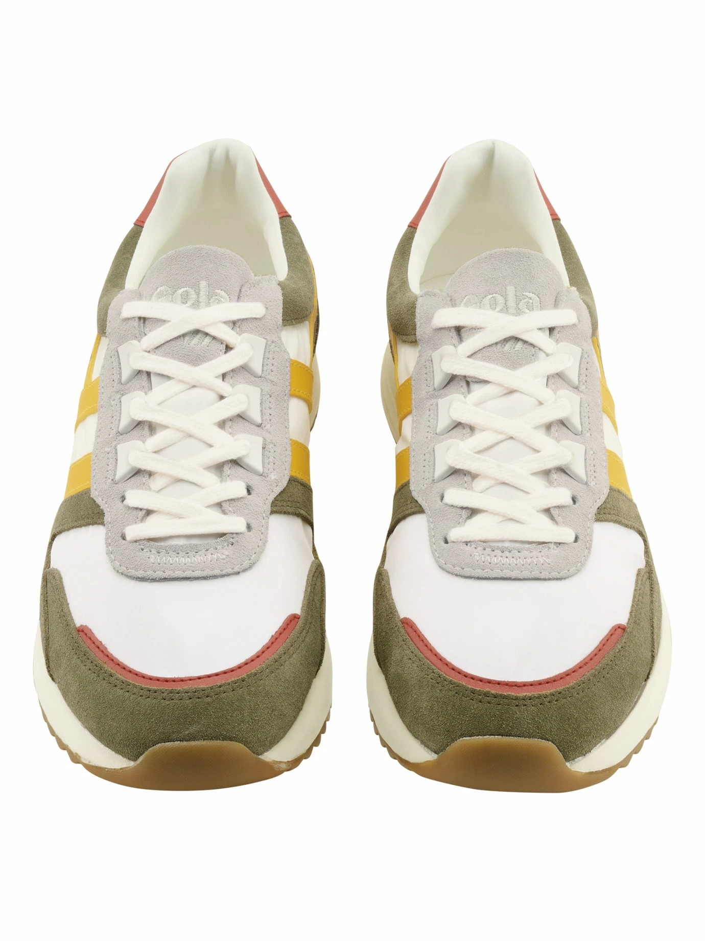 Leichtfüßige Retro-Power. Was Luftschiffe, Ballons und Fallschirme schweben lässt, kann Laufschuhen nicht schaden – dachte sich der britische Sportschuh-Spezialist Gola. Und brachte die leichte „Fliegerseide“ aus strapazierfähigem, wasserfestem Nylon als Obermaterial bei seinem von den 1980ern inspirierten Sneaker Chicago zum Einsatz. Schwerelos drauf abgestimmt: die Laufsohle aus dämpfendem Kunststoffschaum. Sieht übrigens nicht nur zur Jogginghose verdammt gut aus.