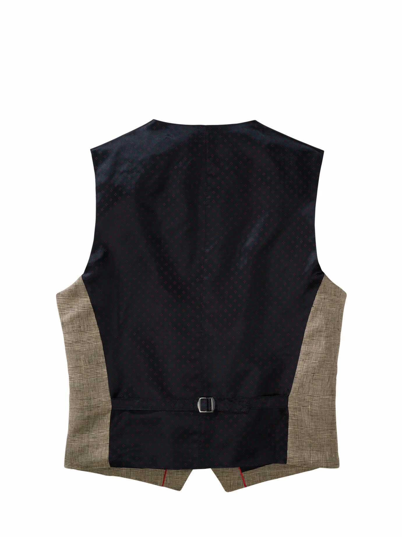Verarbeitung: Anzugweste mit Rückenriegel zum Verstellen der Weite. Zwei Einschubtaschen, eine Billettasche, eine Brusttasche. Echte Corozoknöpfe. Slim Fit.