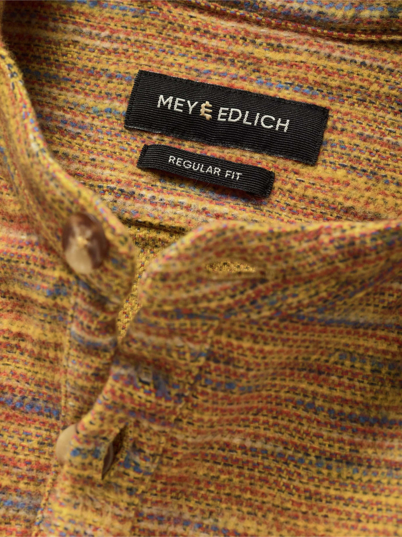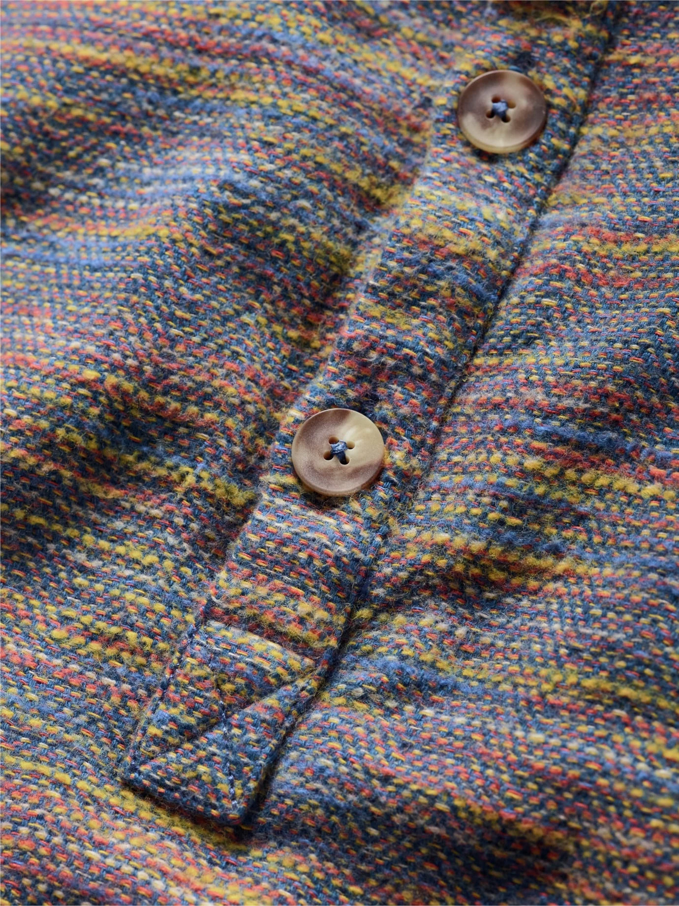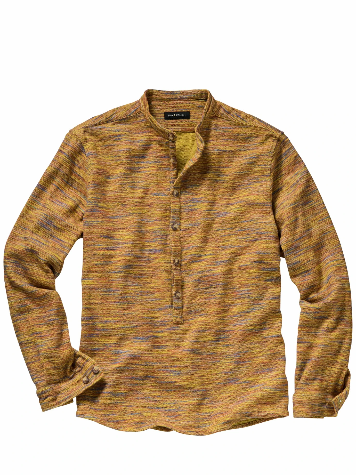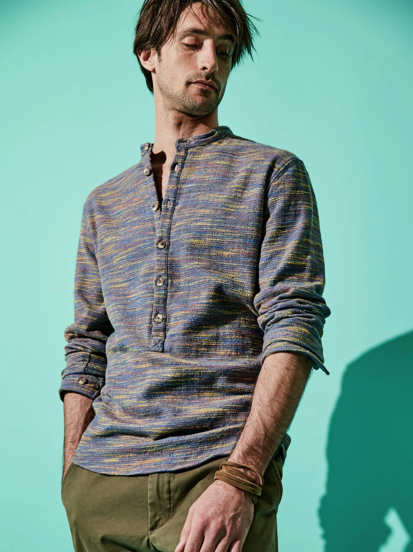 Wenn neues Charisma auf echtes Handwerk trifft. Angelehnt ist es an das einstige Arbeitshemd, mit festem Griff und typischem Stehkragen. Anders als die früheren Hemden, die stets unifarben waren, liegt die Spezialität in seiner unregelmäßigen Farbigkeit. Echte Handwerkskunst: Baumwoll-Flocken mit fühlbaren Dick-Dünn-Stellen werden unterschiedlich eingefärbt und zu einem recht dicken Garn versponnen. Eine Machart, die sich positiv aufs Tragegefühl auswirkt, da das Hemd sanft die Haut massiert statt festzukleben. Passt dazu am besten: die ersten drei Knöpfe der verlängerten Knopfleiste in Holzoptik offen lassen, ein Lächeln und eine stimmige Chino oder Jeans.