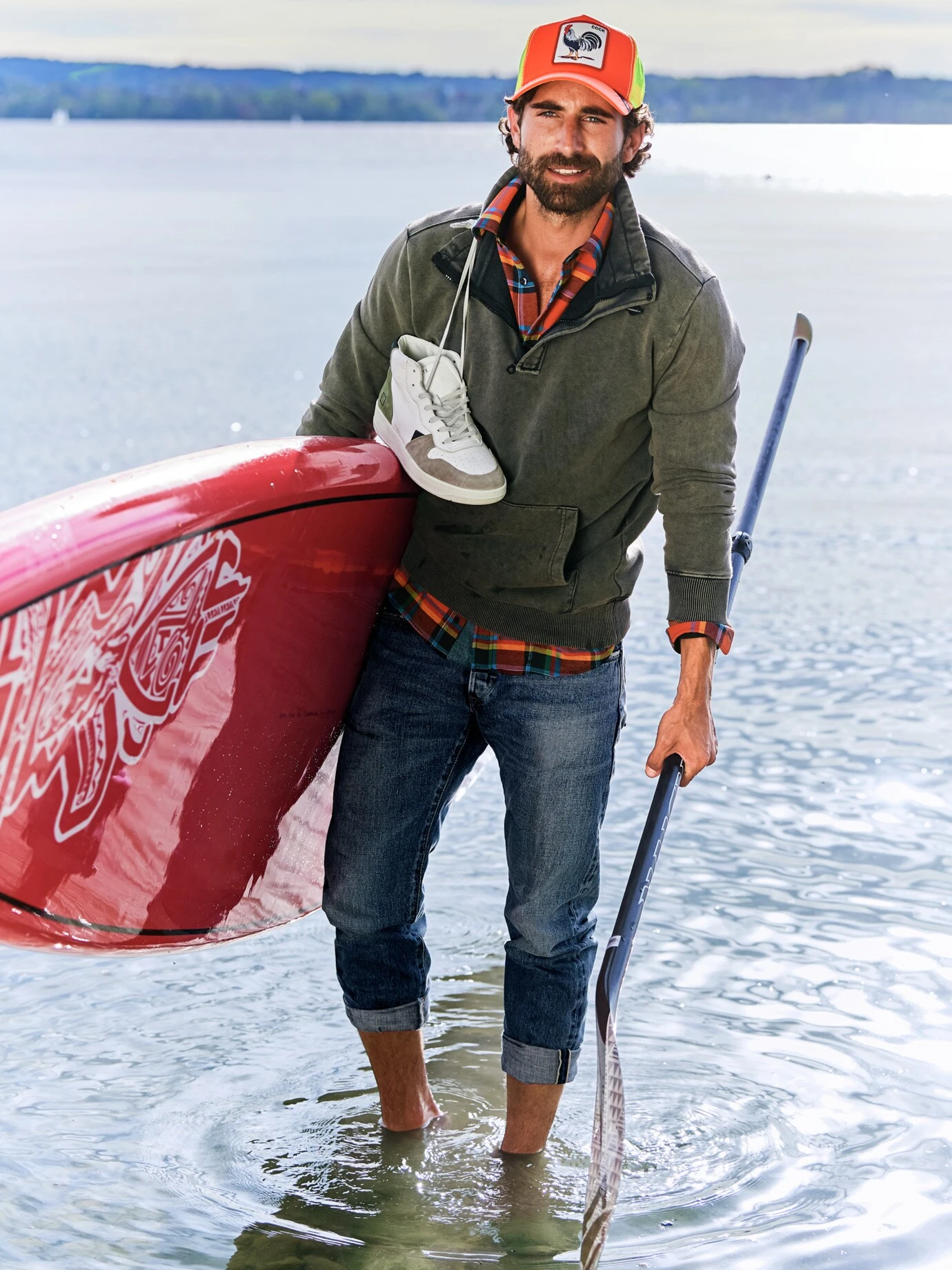 Von Wind und Wellen unabhängig. Inspiriert von den tiefenentspannten Typen, die sich nach dem Stand-Up-Paddling mal eben ein Sweatshirt überziehen. Die feste Baumwolle trocknet auch mal flott den nassen Oberkörper, ermöglicht Luftaustausch und wärmt leicht. Der fette Kragen schützt vor Wind, Hände und Muscheln vergraben Sie in der großzügigen Kängurutasche. Via Zipper das Maß an Frischluft regulieren. Die Bündchen sind bewusst breiter, was lässiger aussieht, wenn Sie die Ärmel mal hochschieben.