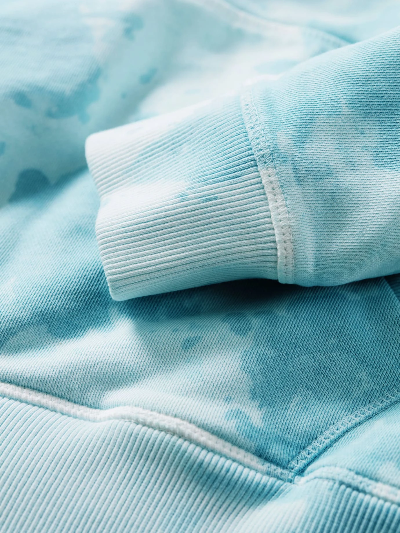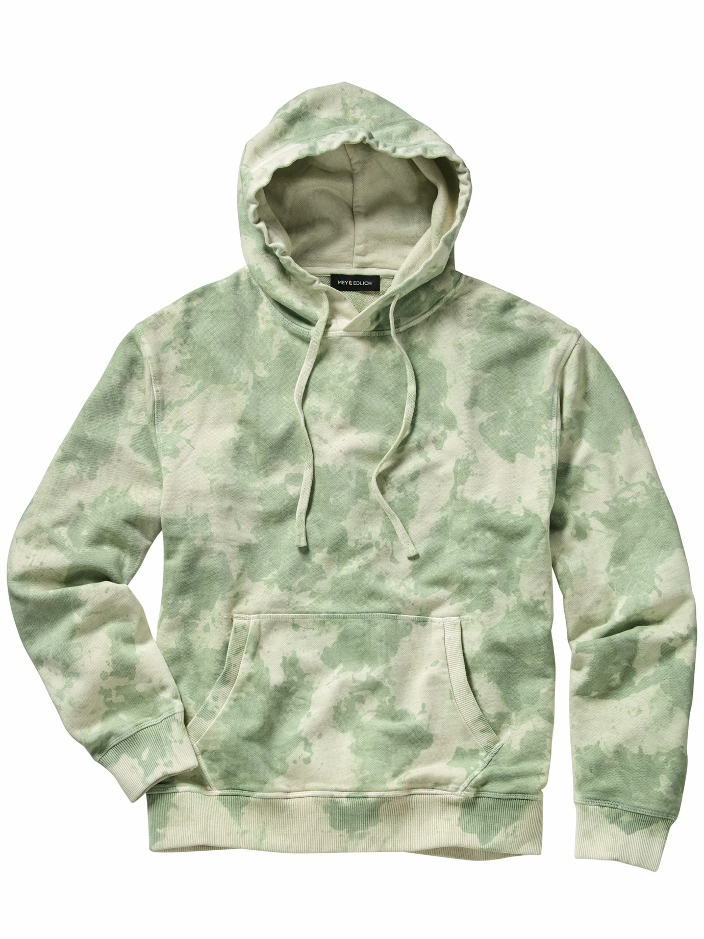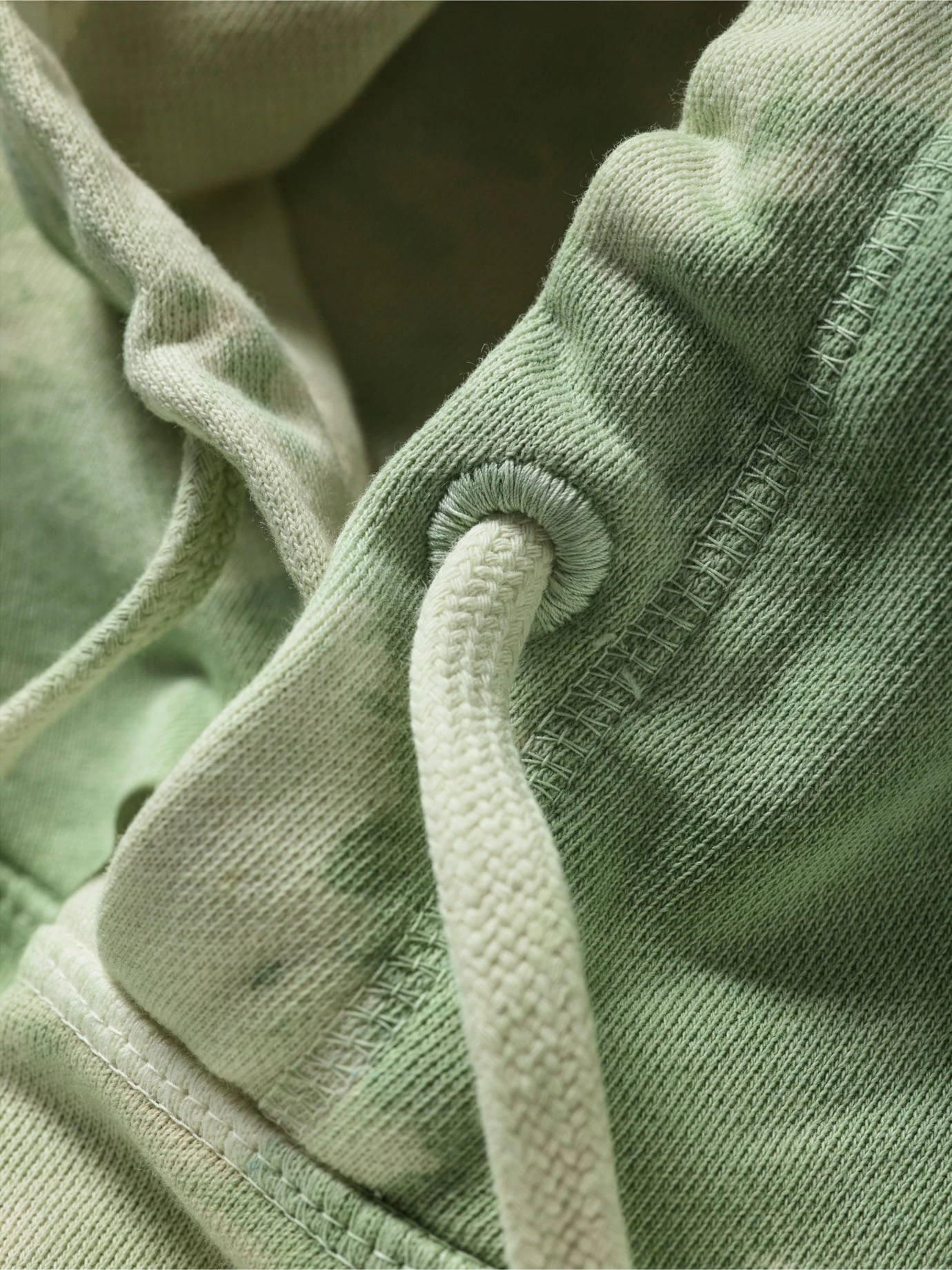 Überlegenes aus den Tiefen der Erde. Gefärbt ist dieser Hoodie mit der Essenz von Mineralsteinen: Die Farbe hält viele Wäschen aus (im Vergleich zu pflanzengefärbten Stoffen) und ist besser für die Umwelt (verglichen mit herkömmlichen Alternativen). Als sei der Hoodie frisch durchs Wasser gezogen, tatsächlich wird er dafür abgebunden und im noch feuchten Zustand geöffnet, das Prinzip Aquarell hält dabei für lange Zeit auf festem Baumwoll-Sweat, die aus nachhaltig, ökologisch wertvollem Anbau stammt.