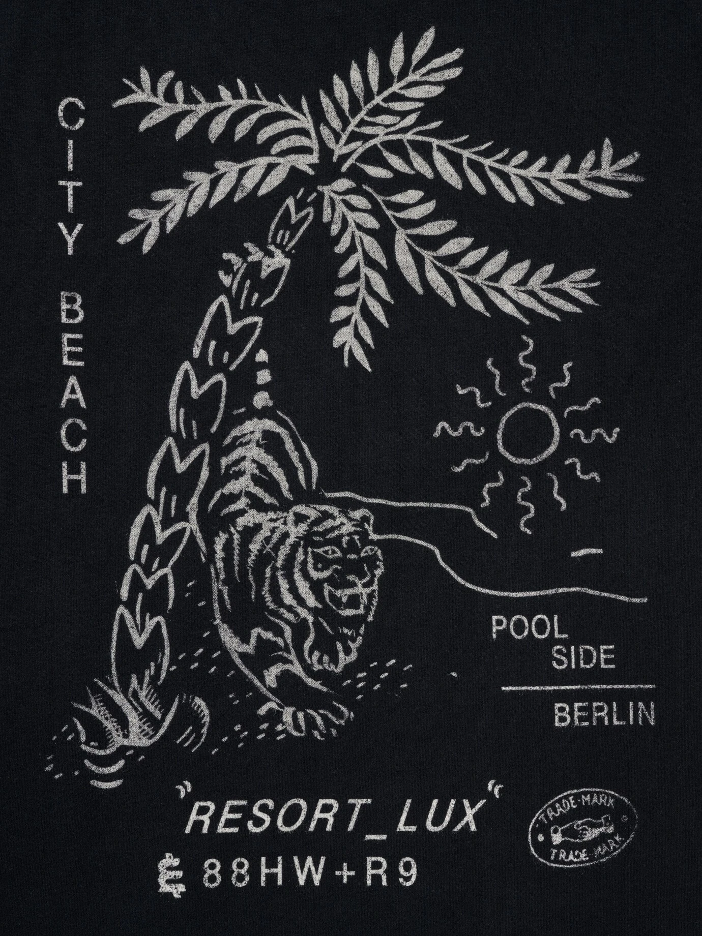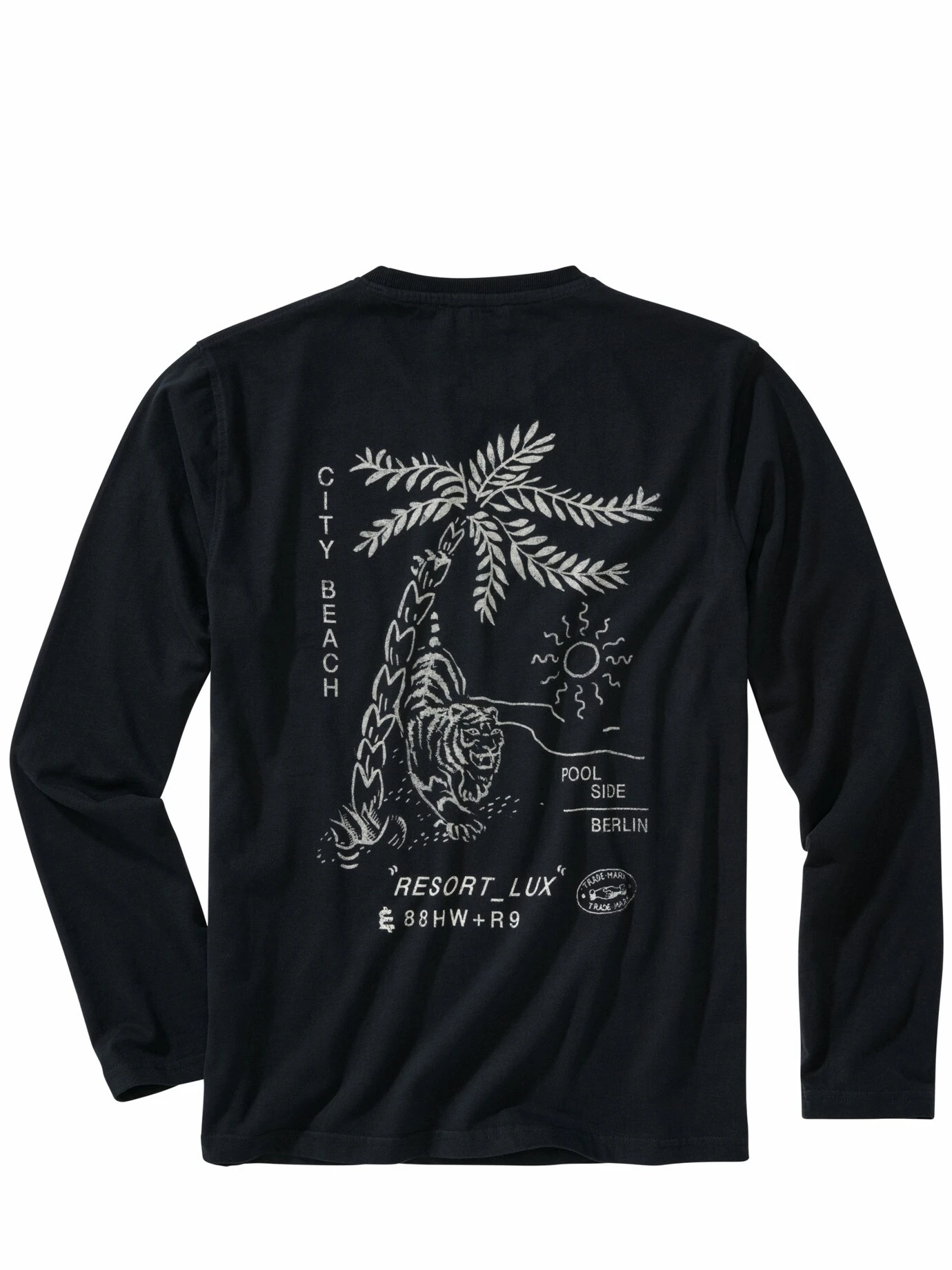 Der Tiger ist längst nicht mehr im Tank. Sein Territorium ist nun der Rücken dieses Longsleeves. Versinnbildlicht die innere Stärke des Trägers und die Energie, die er (bei Bedarf) freisetzen kann. Der starke Print ist auf einen einfachen Jersey aus Baumwolle gebracht. Auf der Haut ist er auf die richtige Weise spürbar, nämlich kaum, zusätzlich aber auch fest genug, damit sich drunter nichts abzeichnet. Dazu braucht es nicht viel, ob die Hose hell oder dunkel ist, hängt vom Wetter ab. Cool auch mit offenem Hemd drüber, der Überraschungseffekt beim Ausziehen ist garantiert.