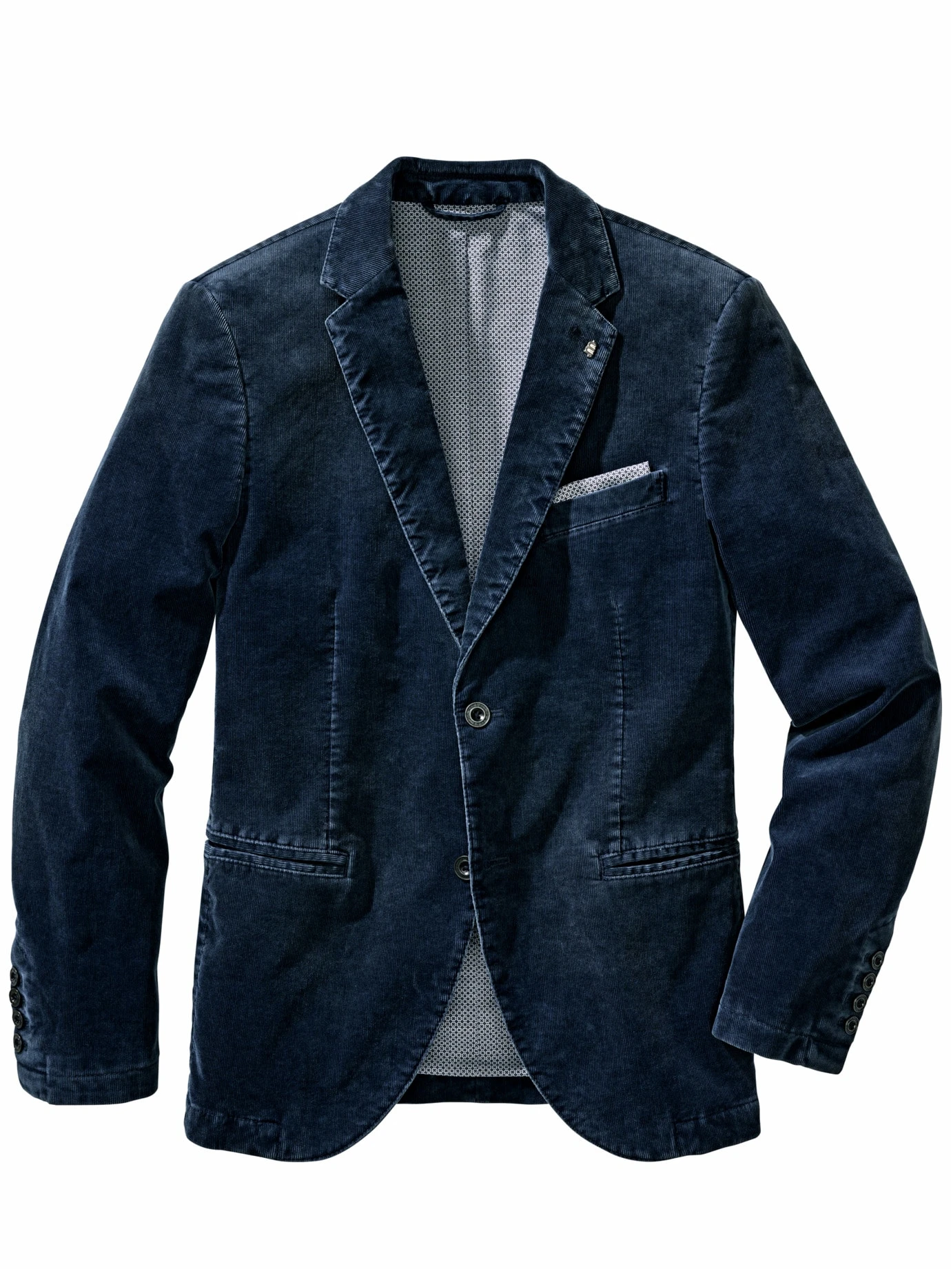 Schreibt mit Ihnen Geschichte. Das Blau sieht aus wie verblasste Tinte, für den Gut-eingelebt-Look und den weichen Griff wurde das Sakko vorgewaschen. Der französische Feincord aus Baumwolle mit einem Schuss Elasthan hat einen festen Stand und geht aber dann ganz geschmeidig mit, wenn Sie zu Stift und Papier oder Laptop und Maus greifen. In der Innentasche steckt das Smartphone, falls Ihr Agent sich meldet. Das gemusterte Futter und der Pin am Revers bringen die hochwertige Ausstattung auf den Punkt. Besonders lässig mit Cargo und Ringelshirt.