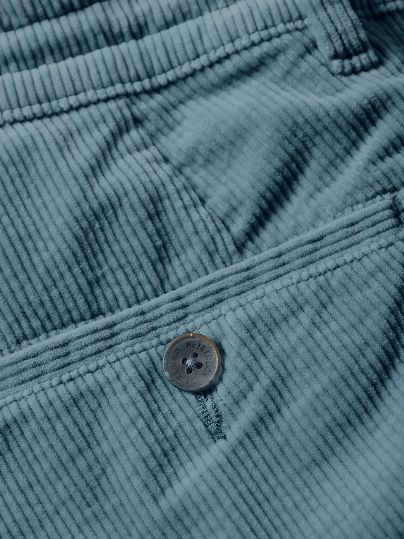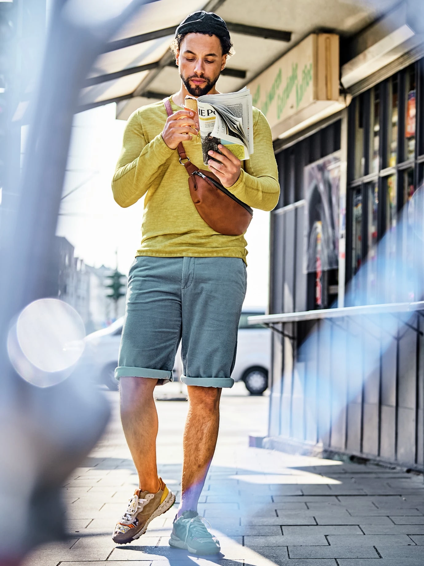 Geht mit Ihrem Tempo. Diese Shorts lotet mit Ihnen Ihre Grenzen aus. Ihr Cord kann dafür einiges. Er stammt aus Frankreich, ist noch immer robust und gibt bei viel Tretarbeit im Sattel dank Elasthananteil nach. Bewegung schätzt auch der Bund, Ihrem Bedürfnis entsprechend justieren Sie die Weite per Tunnelzug. Auf dem Weg zum Büdchen mit buntem Sweatshirt samt weißen Sneakern, wenn’s zieht, zur Windschutzjacke.