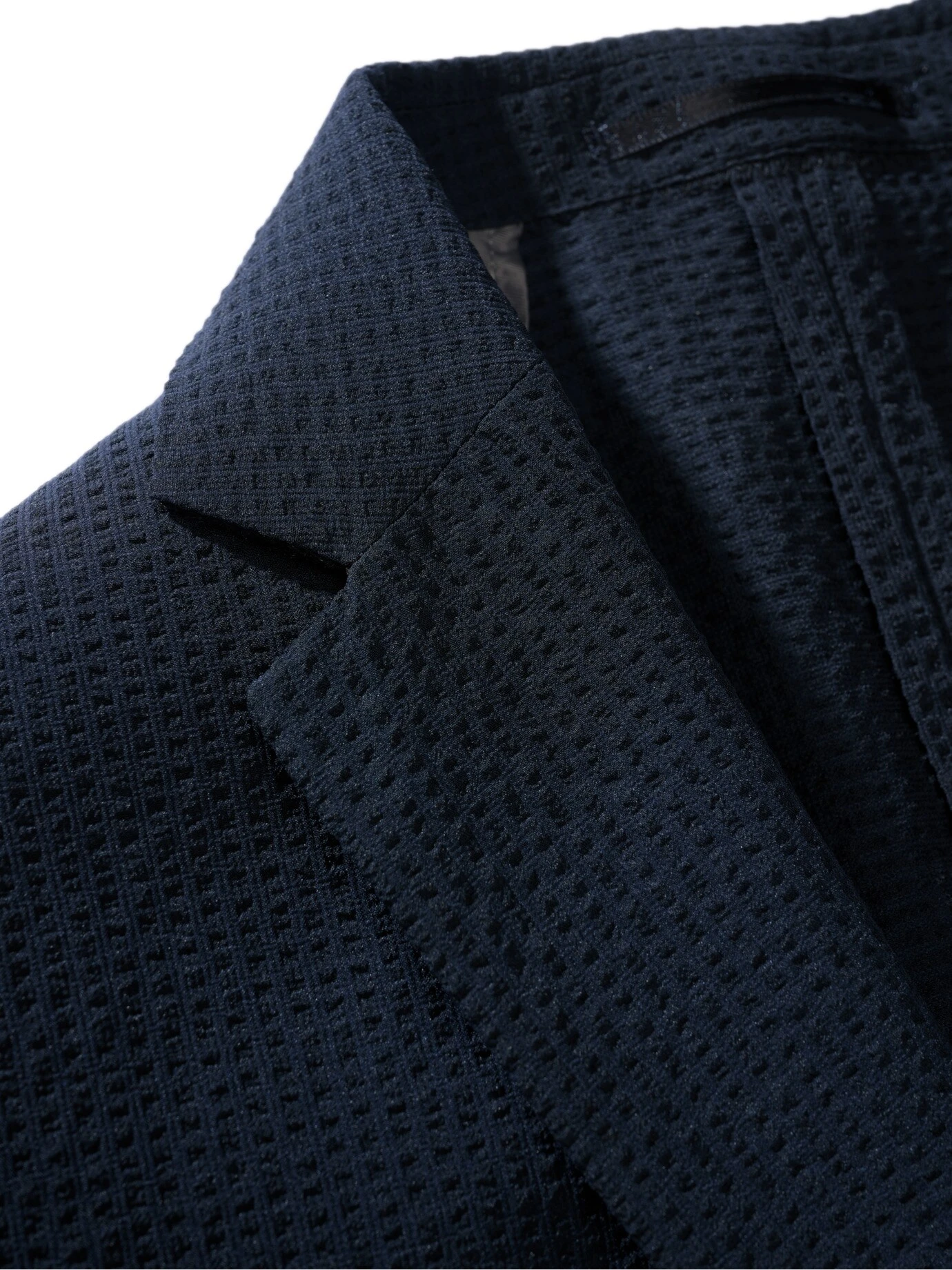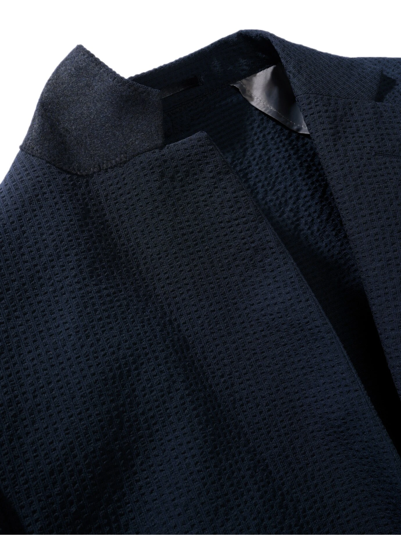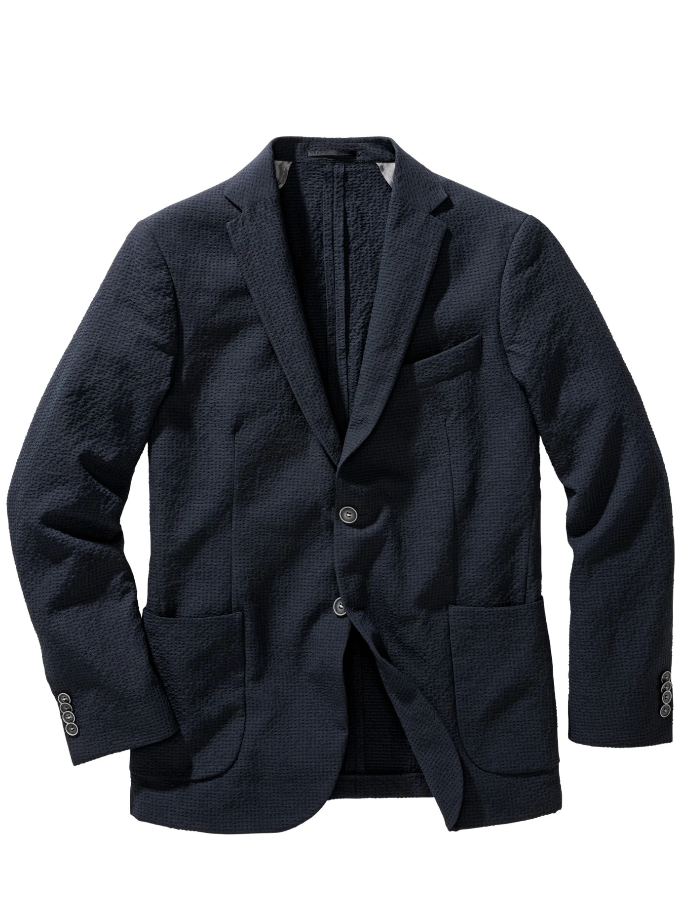Klassisch gegen alle Regeln. Der Kenner staunt angesichts des schönen Materials, das an die dreidimensionale Struktur von Seersucker erinnert. Ganz zu schweigen von den Eigenschaften: Dieses Sakko ist leicht (wiegt nur 333 Gramm), nahezu unverwüstlich (theoretisch bräuchten Sie es nicht aufzuhängen, die Form bleibt), wärmespeichernd (im Sommer ein guter Jackenersatz) und bedingungslos bequem (deshalb ist es ungefüttert). Tatsächlich sorgt dafür ein speziell konzipiertes Hightechmaterial, das wir in Japan fanden. Der seidenartige Glanz und die kleinen quadratischen Vertiefungen im Gewebe sind ein dezenter Hinweis darauf, dass dieses Stück seiner Zeit voraus ist. Minimalistisch kombiniert zu Schwarz und Blau.