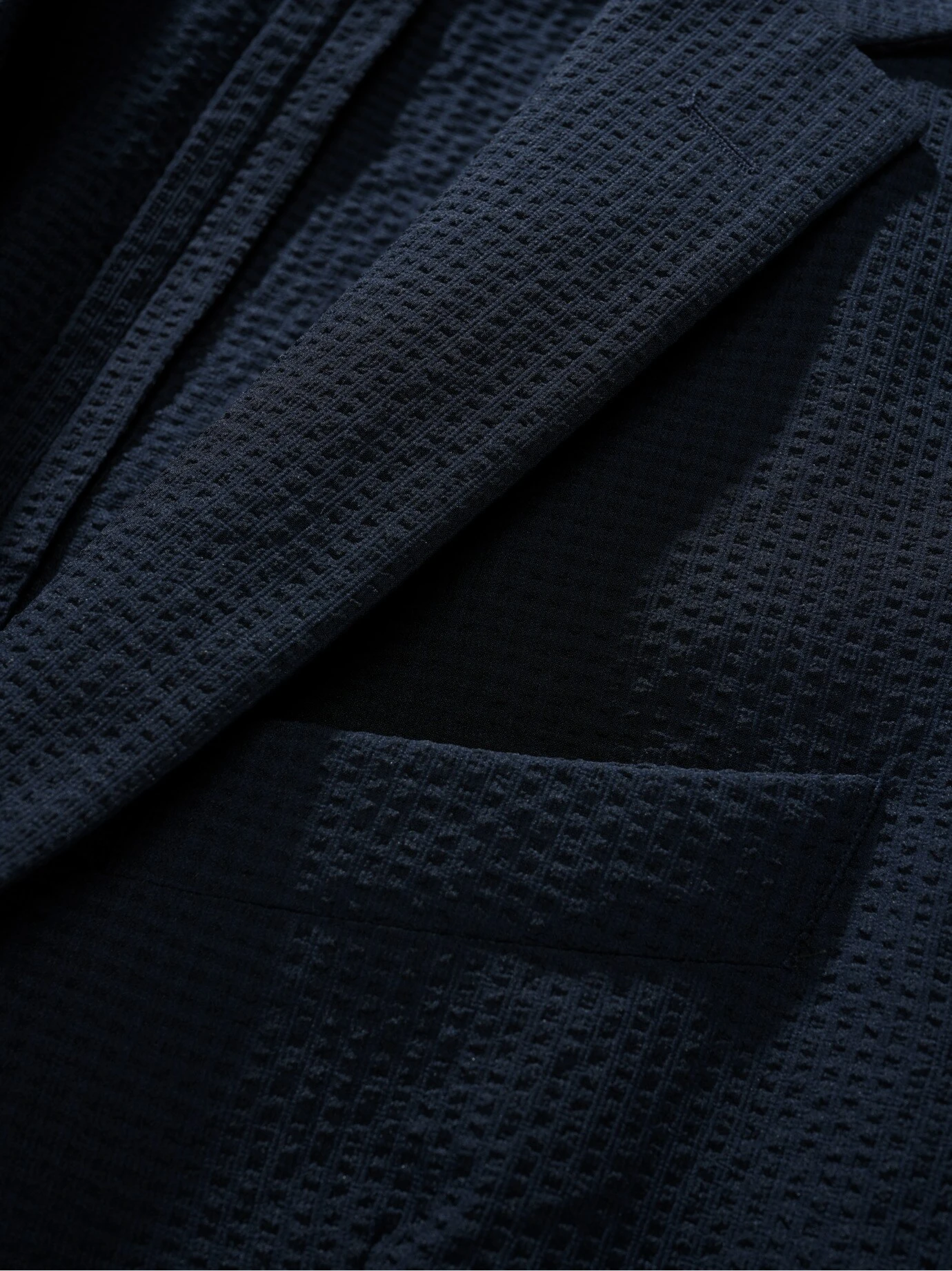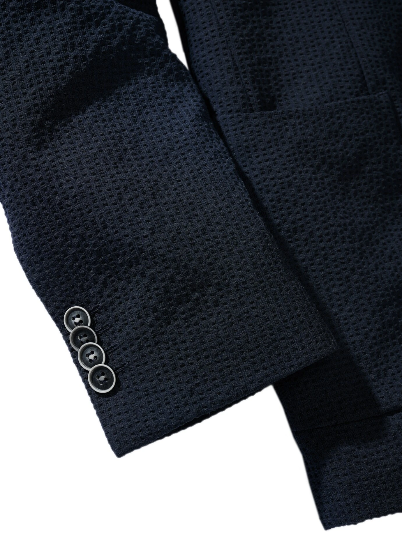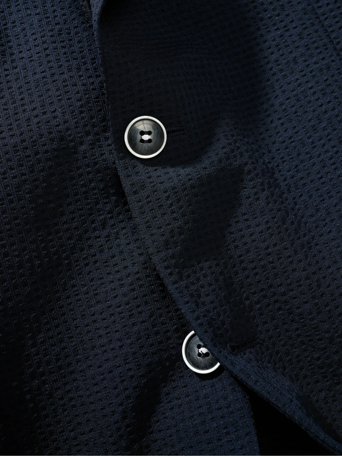 Klassisch gegen alle Regeln. Der Kenner staunt angesichts des schönen Materials, das an die dreidimensionale Struktur von Seersucker erinnert. Ganz zu schweigen von den Eigenschaften: Dieses Sakko ist leicht (wiegt nur 333 Gramm), nahezu unverwüstlich (theoretisch bräuchten Sie es nicht aufzuhängen, die Form bleibt), wärmespeichernd (im Sommer ein guter Jackenersatz) und bedingungslos bequem (deshalb ist es ungefüttert). Tatsächlich sorgt dafür ein speziell konzipiertes Hightechmaterial, das wir in Japan fanden. Der seidenartige Glanz und die kleinen quadratischen Vertiefungen im Gewebe sind ein dezenter Hinweis darauf, dass dieses Stück seiner Zeit voraus ist. Minimalistisch kombiniert zu Schwarz und Blau.