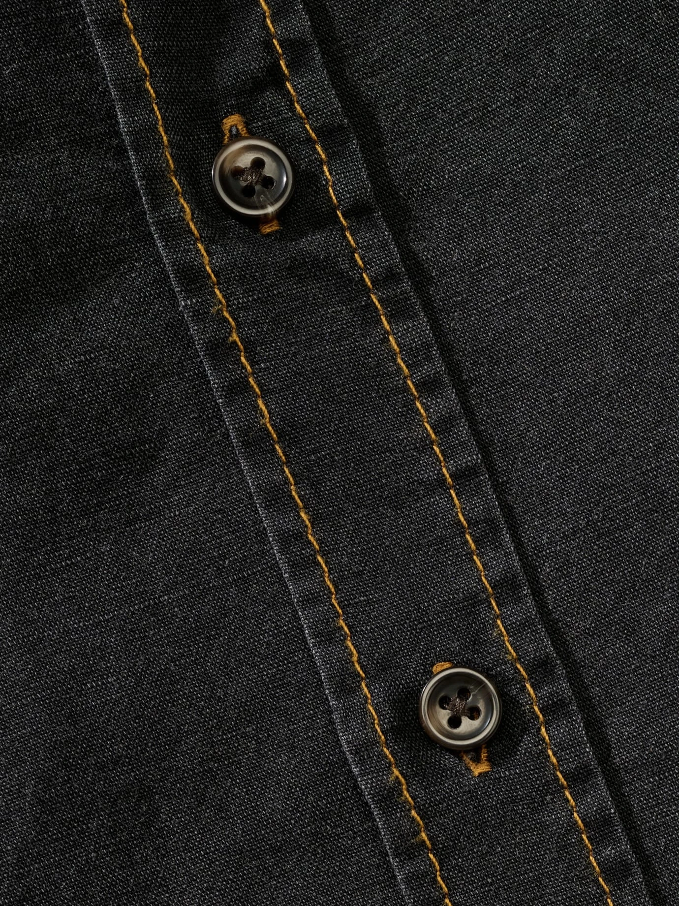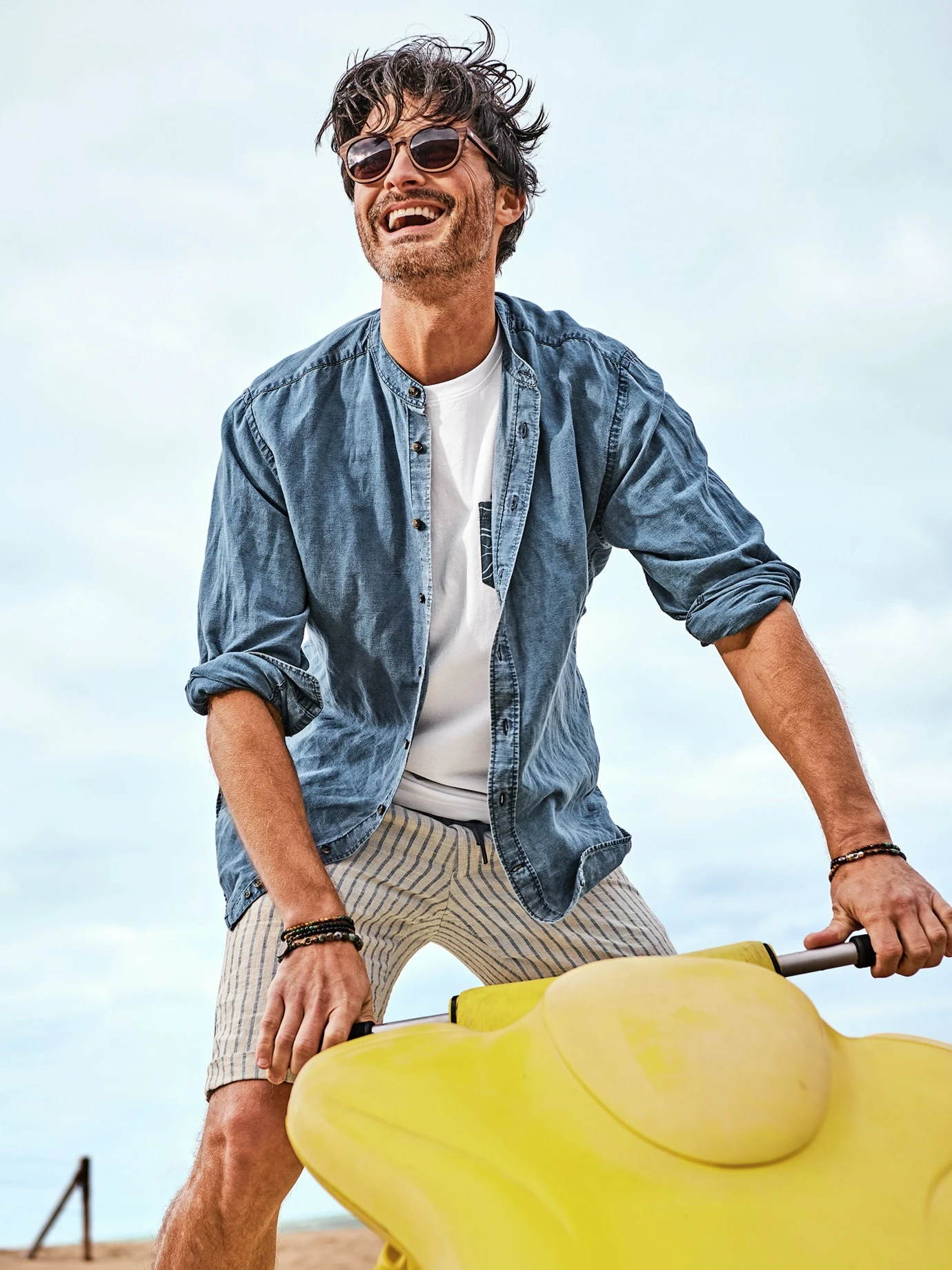 Luftiger als jedes Jeanshemd. Leichter als ein kerniges Jeanshemd und angezogener als ein Shirt. Das Gold der Flachsstängel, das Leinen, verleiht dem Denim den nötigen Stand. Die optische Coolness erreicht das Hemd, indem es mehrfach runtergewaschen wird. So erlangt der Stoff ein neues Maß an Gefälligkeit, charakteristisch sind die körnige Struktur und sanfte Knitter. Noch immer augenfällig zu dunklem Denim, im Büro sogar zur Glencheck-Chino.