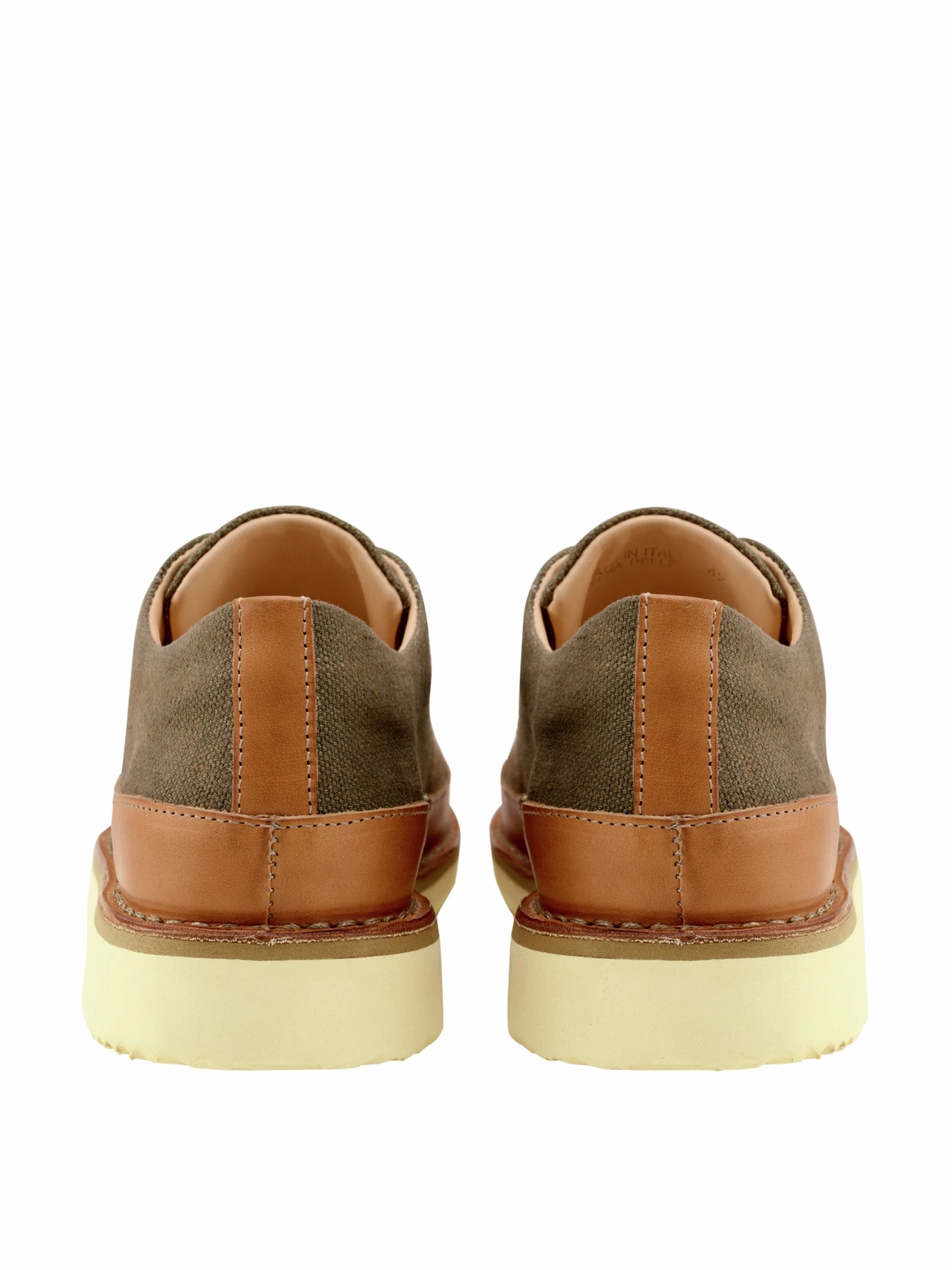 Material: Obermaterial: Baumwoll-Leinen-Canvas, Rindleder. Innenfutter, Decksohle: Kalbleder. Laufsohle: Schaumstoff. Abbürsten.
