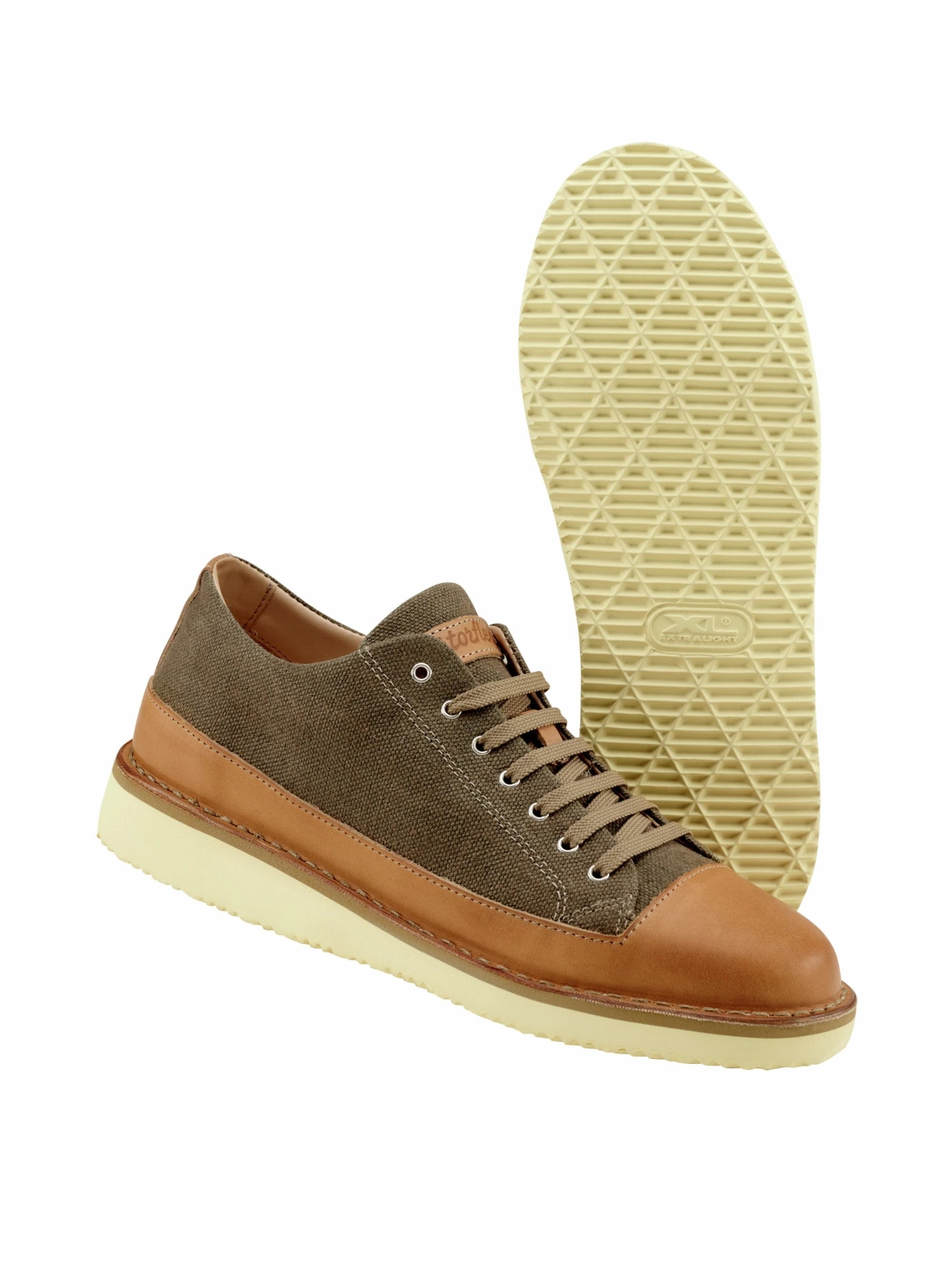 Gehobene Kategorie Sneaker. Der Kastflex ist der perfekte Schuh, wenn nur Leder zu viel, Turnschuh zu wenig ist und übrige Schuhe irgendwie satt gesehen sind. Die Materialkombination aus sommerlichem khakifarbenem Baumwoll-Leinen-Canvas und hellem Rindleder ist stimmig und fällt auf, aber nicht too much.