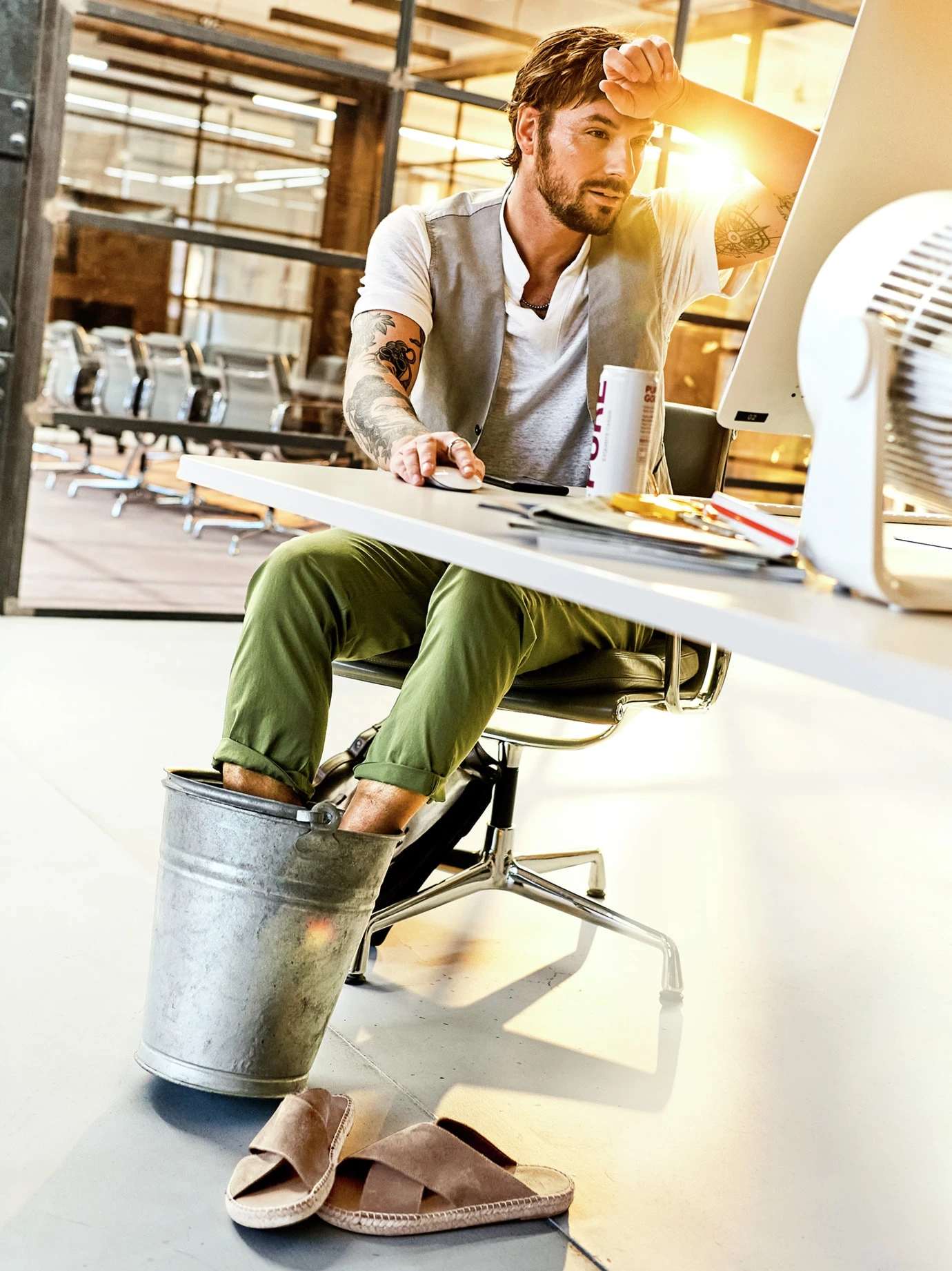 Sein Prinzip ist so alt wie genial. Die Riemen sind wie ein X geformt und umschließen den Fuß optimal. Ob breiter oder schmaler Fuß, hoher oder tiefer Spann – die Sandale sitzt. Das weiche Rindveloursleder wird mit der Zeit noch geschmeidiger, ein zusätzliches Lining schützt vorm Scheuern. Gefertigt wie ein traditioneller Espadrilles, mit einer Laufsohle aus Jute – unschlagbar bei Hitze – und Naturkautschuk, die unempfindlich gegenüber Schmutz ist.