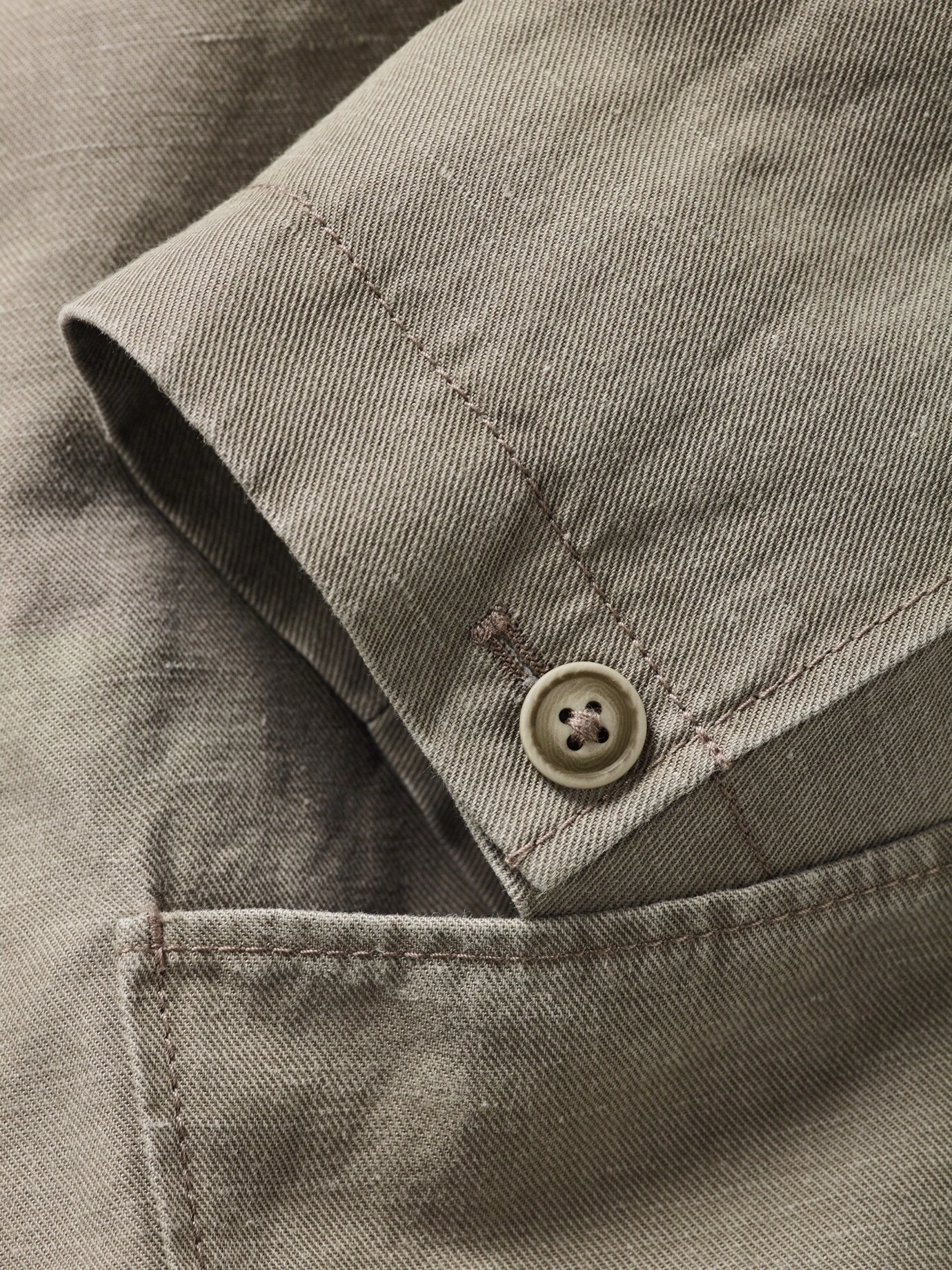 Die abendliche Ablöse fürs Casualsakko. Stilistisch stand es zumindest hierfür Pate, Sie erkennen es am geteilten Ärmel, dem runden Abstich am Saum und dem Kragen, der – wenn Sie wollen – zum Revers abfällt. Stilistisch liefert es den Spagat zwischen halb Hemd und halb Jacke, mit dem Hauch von Zupackermentalität. Ohne Taillierung fällt es modisch gerade, der Baumwoll-Leinen-Stoff stammt vom italienischen Weber Bonomi. Wird gern zu T-Shirt, Chino und Sneakern getragen, geschlossen oder offen.