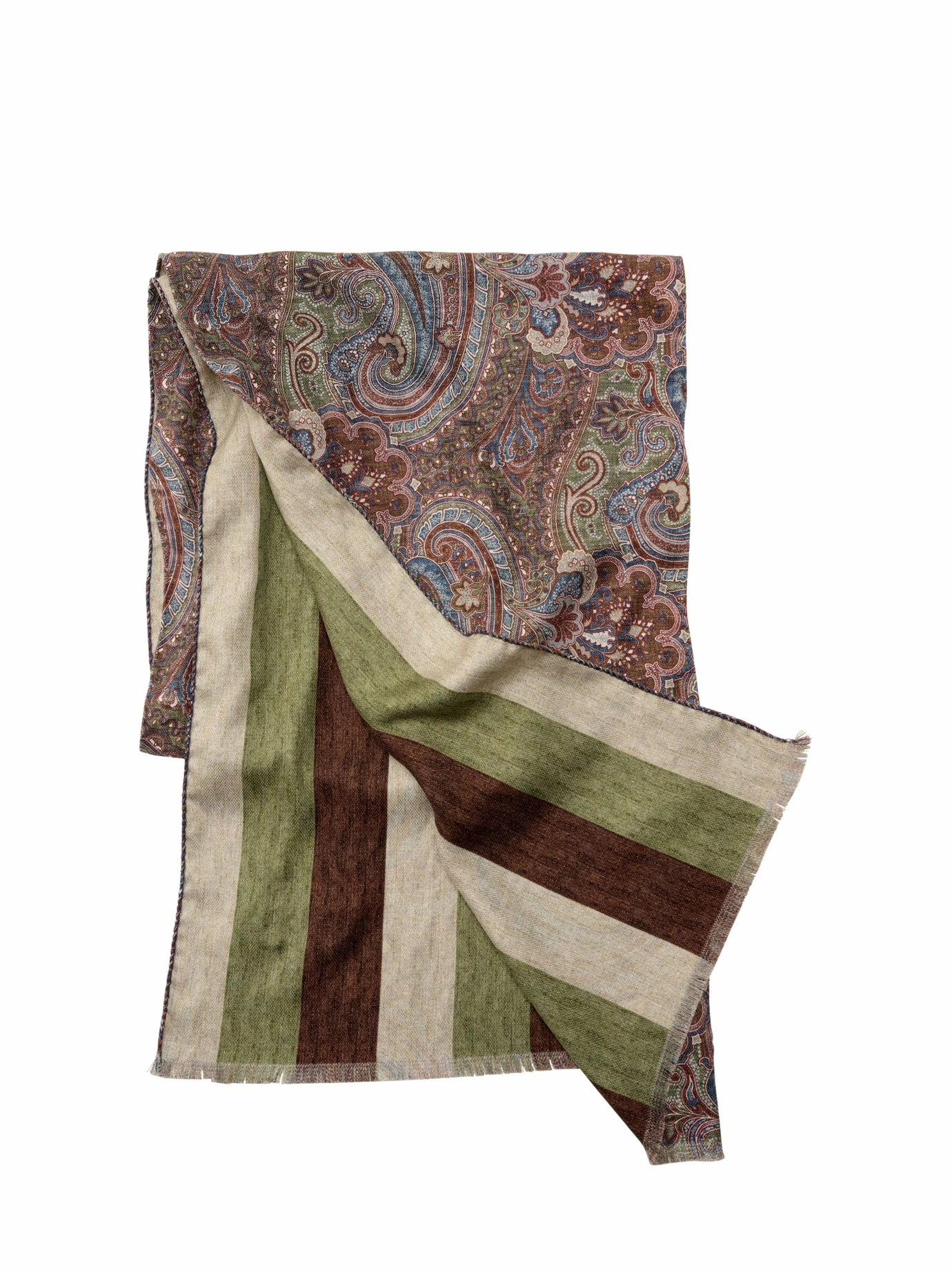 Führt ein Doppelleben an der Garderobe. Heute so, morgen anders. Dieser Schal aus schwerer, matter Seide kann gradlinig, reduziert und zurückhaltend sein. Oder andererseits opulent, psychodelisch und eigenwillig. Je nachdem ob Sie die Blockstreifen- oder die Paisley-Seite nach außen tragen und kombinieren.